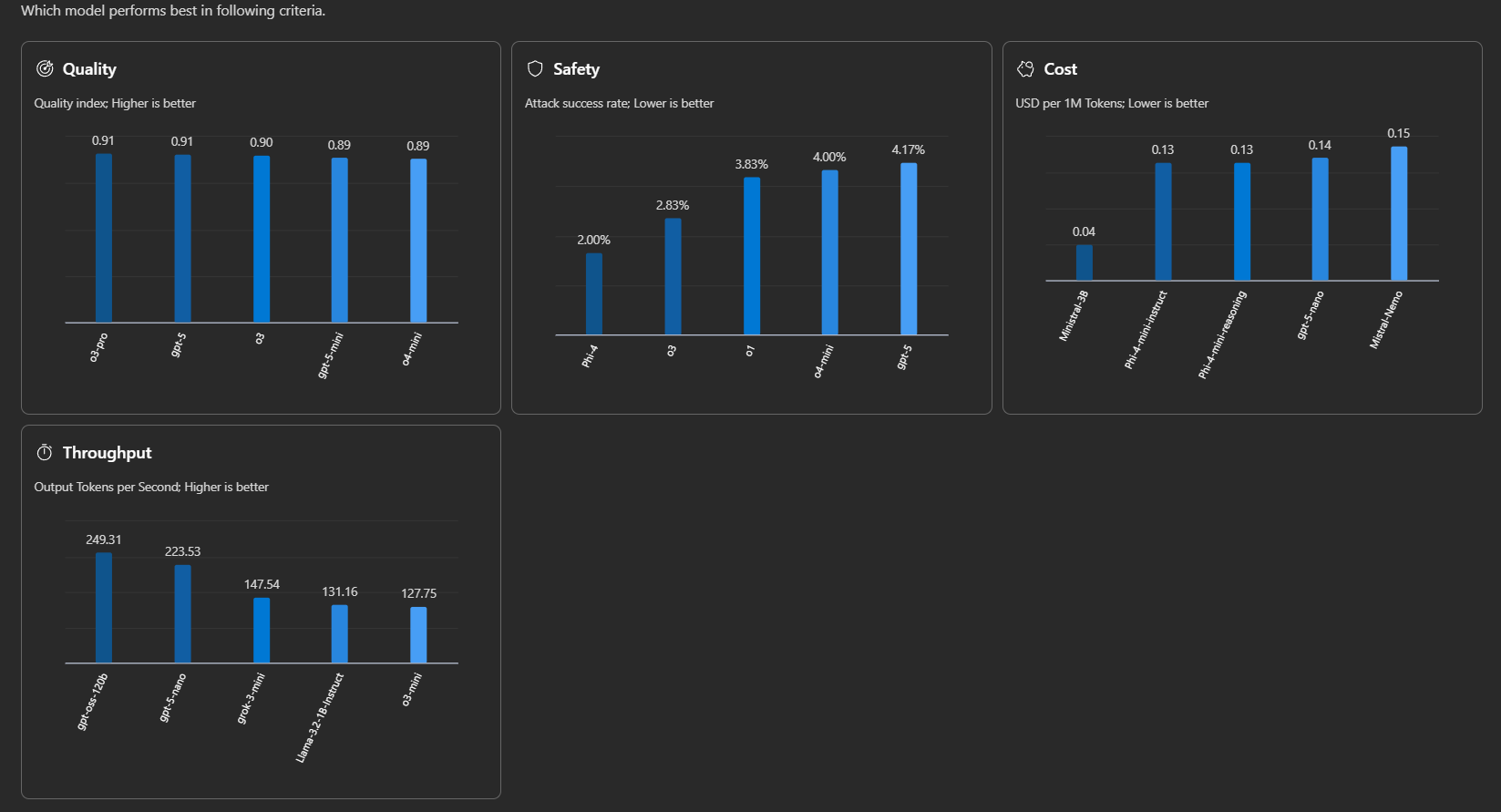 Some AI development platforms provide tools which can be used to compare models and select the most appropriate model suitable for use. An example of such comparison tool is shown below using Microsoft’s Azure AI Foundry: